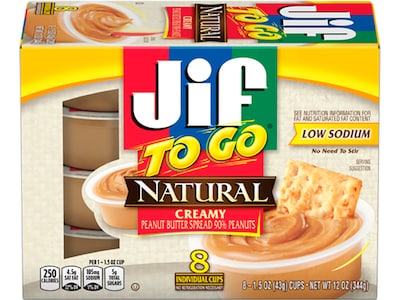 Round, plastic portion-control cups make peanut butter convenient anywhere: from tabletop caddies and buffets to grab-and-go snacks and more. The delicious taste of Jif To Go Natural peanut butter spread in a convenient, right-sized cup. Perfect for dipping your favorite snacks.