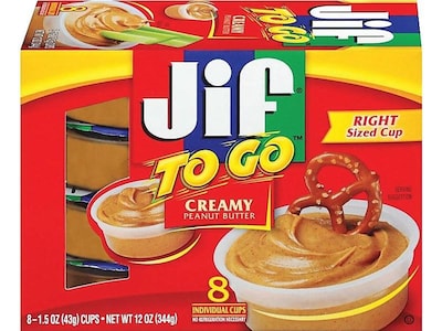 Take snacks on the go with this box of eight Jif To Go 1.5-ounce creamy peanut butter cups.
