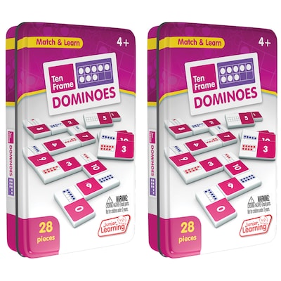Ten Frame dominoes include a 28 piece set on thick plastic dominoes. Dominoes come in a collectors tin for storage. Children will love the feel of real dominoes as they complete the number matching game. Ages 4+. Sold as 2 complete sets of dominoes.