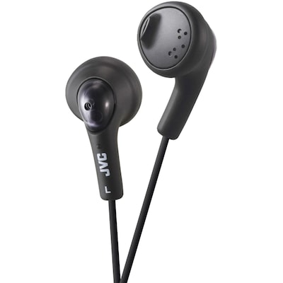 The JVC gummy black rubber in-ear earbud features oval form soft body for comfort fit and powerful sound.