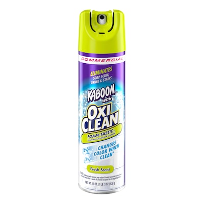 Tired of scrubbing? Try Kaboom Foamtastic, the only foaming cleaner that changes color to let you know the surface is clean. As it sprays on blue, the OxiClean stain fighting bubbles get to work powering through soap scum, hard water, calcium and lime stains. When it turns white you just wipe away to reveal a deep clean and a sparkling shine with absolutely no dull residue left behind. Will not stain surfaces and leaves behind a fresh scent.