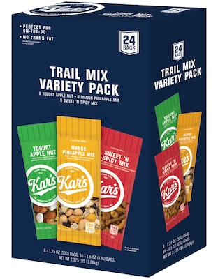 Keep a supply of these tasty nut mixes on hand for the nutritious boost you need to get through the day. This box contains eight bags of Mango Pineapple trail mix, eight bags of Sweet 'n Spicy mix and eight bags of Yogurt Apple nut mix. The convenient 1.5-ounce and 1.75-ounce bags of Kar's variety pack make them easy to portion out.