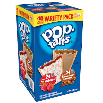 Keep these PopTarts packs on hand to feed students or employees. The package of 48 includes strawberry and brown sugar flavors to meet a variety of preferences, and each set of two is sealed for freshness. These Kellogg's toaster pastries can be eaten as is or warmed for a convenient anytime snack.