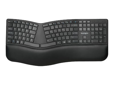 The Kensington Pro Fit Ergo split and sloped keyboard comes with adjustable reverse tilt and a built-in wrist rest. This ergonomist-approved wireless keyboard positions your hands for improved comfort. Its features include dual wireless connectivity (2.4GHz and Bluetooth 4.0 LE) with 128-bit AES encryption security; quiet typing; spill-proof keys; F-keys for shortcuts; caps lock, number lock, and scroll lock; a three-mode power-saving switch; and a replaceable receiver.