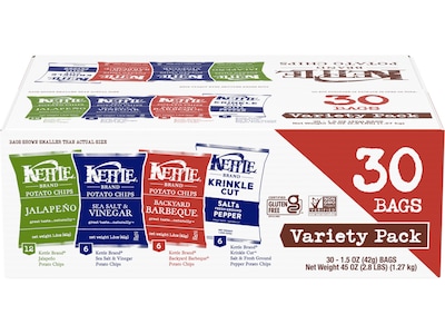 The Kettle potato chips variety pack offers 30 individually wrapped 1.5 oz. bags, each packed with the crispy, satisfying crunch you love. This assortment features a selection of classic flavors, including Sea Salt & Vinegar, Salt & Fresh Ground Pepper, Backyard Barbeque, and Jalapeno, providing a delightful taste experience in every bite. Perfect for snacking at home, work, or on the go, this pack ensures you never run out of your favorite savory treats. Enjoy a flavorful variety in every bag.