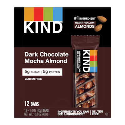 Stock up on a snack that is low in sugar and high in fiber with this 12-pack of dark chocolate mocha bars. With only five grams of sugar and five grams of protein, these KIND dark chocolate bars make a healthy snack anytime, anywhere.