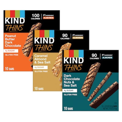 - Pack includes 10 KIND Thins Dark Chocolate Nuts & Sea Salt 0.74 oz bars, 10 KIND Thins Peanut Butter Dark Chocolate 0.74 oz bars and 10 KIND Thins Caramel Almond & Sea Salt 0.74 oz bars for a total of 30 nutritiously thin bars