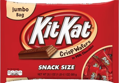 Indulge your sweet tooth with these mini candy bars. The crunchy wafer texture mixed with the creamy milk chocolate combine for delicious flavor, while the miniature size makes them perfect for snacking, adding to lunches or stocking up the office candy supply. These Kit Kat Snack Size milk chocolate bars come individually packaged, offering convenient distribution and preventing them from getting melted together.