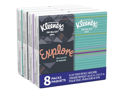 The Kleenex On the Go Ultra three-layer tissue is soft, durable, and thick and comes in a convenient travel pack that is small enough to fit in pockets, purses, backpacks, or travel bags. The to-go box's design contains various colors and designs. Produced from 100% responsibly managed forests.