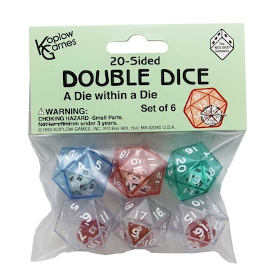 Koplow Games 20-sided double dice, a die inside of a die, is great for math games! Roll it and add, subtract, multiply or divide the numbers. A great way to practice and understand basic math skills and enhance games and activities. Each pack includes 6 dice in assorted colors. Sold as 3 packs for a total of 18 dice.