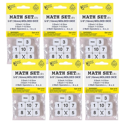 Koplow Games Math Dice Set is a fun, hands-on way for students to learn basic math skills. Children learn more effectively when it is reinforced through play. Perfect for individual play, in small groups or as a classroom making these dice a great educational resource. Dice measure 16mm (5/8"). Each set includes 8 dice: 3 each of 1-6 dice, 3 each of 7-12 dice and 2 math operator dice. Sold as 6 sets, 48 dice total.