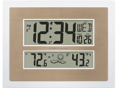 The La Crosse Technology elegant digital clock offers daylight saving time resets, 12/24-hour atomic time, and date settings. Wireless outdoor temperature sensor transmits within 330ft range of clock and provides accurate 12-hour future forecast. Set to any of the seven time zone selections and automatically adjusts (optional) for daylight saving time. Its soft, contemporary design makes it suitable for office or the home, displaying time, temperatures, and calendar.