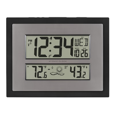 The La Crosse Technology elegant digital clock offers daylight saving time resets, 12/24-hour atomic time, and date settings. Wireless outdoor temperature sensor transmits within 330ft range of clock and provides accurate 12-hour future forecast. Set to any of the seven time zone selections and automatically adjusts (optional) for daylight saving time. Its soft, contemporary design makes it suitable for office or the home, displaying time, temperatures, and calendar.