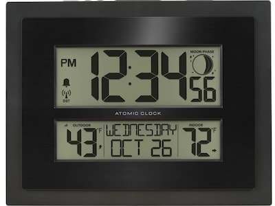 The La Crosse Technology digital clock offers daylight saving time resets, 12/24-hour atomic time, and date settings. Set to any of the seven time zone selections and automatically adjusts (optional) for daylight saving time. Shows time, temperature, calendar, and moon phase. Its soft, contemporary design with a polished black overlay and matted black frame makes it suitable for office or the home, displaying time, temperatures, and calendar.