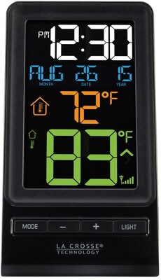 Bright multiple colored digital thermometer and clock keeps you informed with accurate temperature and time. Indoor display receives frequency wirelessly from outdoor temperature sensor. Battery operated or use indoor base with provided AC adapter.