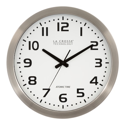 Keep precise track of time with this 16-inch atomic wall clock. Featuring a large 16-inch face and bold black numbers, this atomic clock offers easy visibility from a distance and keeps you on schedule by setting itself to the exact time. This La Crosse Technology clock elevates office decor with a handsome silver case and a sleek design.