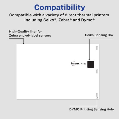 Compatible with a variety of direct thermal printers including DYMO(R), Seiko(R) and Zebra(R); label comparable to DYMO 30251