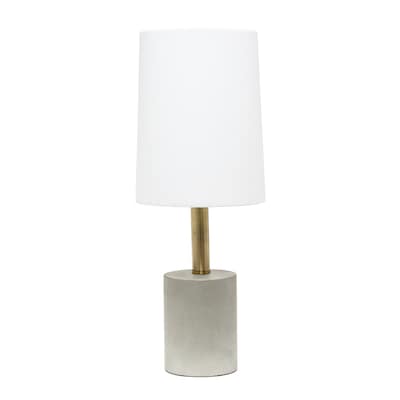 Bring a modern and industrial touch to any room in your home while keeping it simple! The cement base is beautifully accented by antique brass for a hint of elegance, complemented by a white fabric shade. The perfect size lamp for your night stand, end table or office desk!