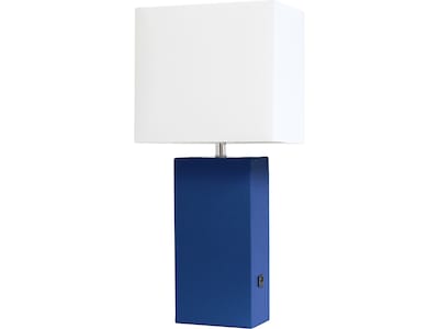 - Features a rectangular white fabric shade for a clean, fresh look and a rectangular faux leather wrapped base in blue