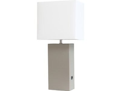 - Features a rectangular white fabric shade for a clean, fresh look and a rectangular faux leather wrapped base in gray