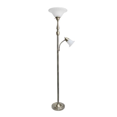 Brighten up your living space with this elegant 2 light floor lamp. It features 1 adjustable reading light to focus on the area of your choice. The beautiful metal base is accented by scalloped glass shades to complete the timeless look. Perfect for your bedroom, office, foyer or living room!