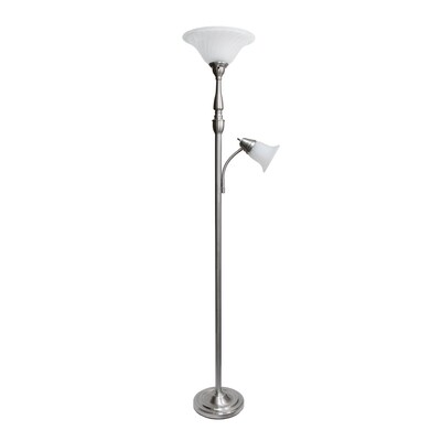 Brighten up your living space with this elegant 2 light floor lamp. It features 1 adjustable reading light to focus on the area of your choice. The beautiful metal base is accented by scalloped glass shades to complete the timeless look. Perfect for your bedroom, office, foyer or living room!