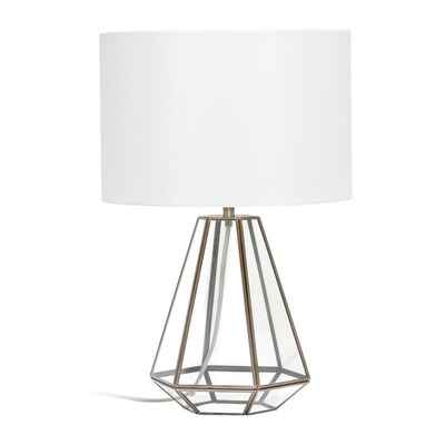 A stunning piece of décor suited to properly light your space is the key to designing this gorgeous triangular shaped table lamp. A transparent glass base with brass metal accents is paired with a white drum shade to inspire a vintage feel with modern class. The glamour and elegant style of this lamp powers on with a push pin on/off switch making it convenient to place bedside, atop your living room accent table, your foyer entrance, or office space!