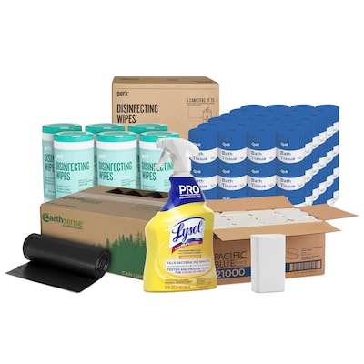 Bundles includes: Toilet paper(96 rolls), paper towels(16 packs), all purpose cleaner(3 pack), wipes(6 packs), trash bags(100 bags)