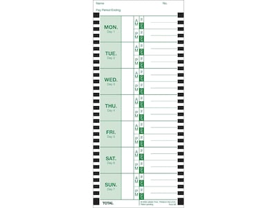 Made from heavy white card stock, these Lathem single-sided time cards hold up to use all week long, even when inserted into the time clock up to four times per day to record arrival, break, and departure times. The crisp white background color helps the green printing stand out for easy visibility.