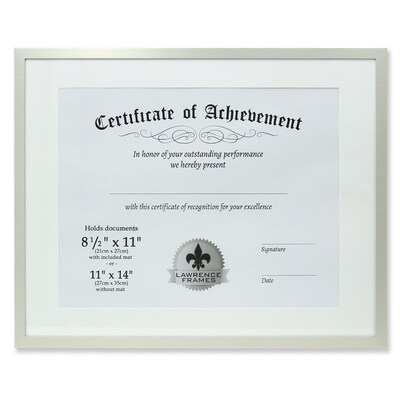 "Lawrence Frames 240111 Silver Aluminum 14.25" x 11.25" Document Frame" is an ideal personal touch for your home or workspace