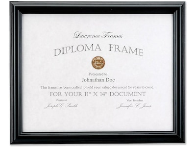 Draw attention to a diploma, photograph, or other 11 x 14-inch document with this black wood frame, which is backed with black velvet for damage-free adjustment on walls. Mount this Lawrence Frames document frame on a wall or place it on a tabletop to showcase either portrait- or landscape-oriented items.
