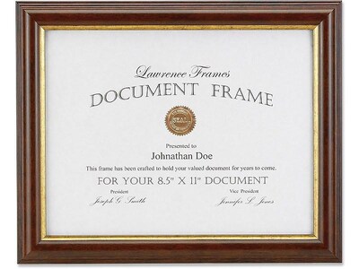 Bring a professional look to office walls with this document picture frame. The convenient dimensions accommodate letter-size documents for a perfect fit, and the rich walnut finish with gold accents adds an upscale finishing touch. Black velvet backing helps papers and photos retain their original shape. This Lawrence Frames picture frame can be placed on a shelf or mounted on the wall, providing versatile placement options.