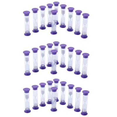 Sand timers are great for games, timed tests and other classroom time managements. This set includes 10 plastic, safe, three minute timers. Sold as 3 sets for a total of 30 sand timers.