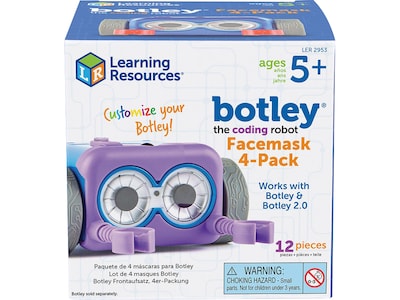 Make coding more colorful with new facemasks for Learning Resources Botley the Coding Robot Facemask. Whether you're coding during homeschooling sessions or in the classroom, you'll always know which Botley is which with the help of the Botley the Coding Robot Facemask four-pack. Designed as a fun accessory pack for both Botley and Botley 2.0, these cool coding facemasks add a touch of customization to every coding adventure. This set's four facemasks come in four fun colors: light blue, dark blue, purple, and translucent yellow. Give a solo Botley lots of costume options, or use the facemasks to keep track of multiple Botleys at once, whether they're running a coding race, coding their way through a STEM obstacle course, or playing a fun game of Botley Says, you'll have an easy way to tell your little coding robots apart. Made from sturdy plastic, each mask in the Botley the Coding Robot Facemask four-pack works with all other Botley accessory sets and is ready for years of screen-free coding fun.