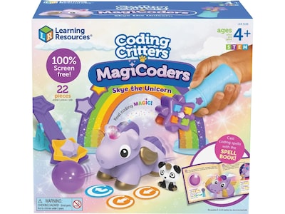 Meet Skye, your magical coding friend. Preschoolers discover the magic of coding with this pet unicorn who's ready for early STEM fun. Code along with the magical adventures in Skye's coding spellbook; set your wand to Spell mode, and cast 12 coding spells that make Skye dance, light up, and more, then program Skye to move through her fantasy challenges in Code mode. You can even design your own endless coding challenges with the Learning Resources Coding Critters MagiCoders: Skye the Unicorn 22-piece interactive pet playset.