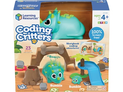 These playful dino pets bring early STEM concepts to preschool learning through 100% screen-free coding. Kids code along with their new pets' storybook adventure, and help the clumsy Rumble and bumbling Bumble have a playtime they'll never forget! Each storybook coding challenge unfolds in the Coding Critters Rumble & Bumble fun pet play set — can you code Rumble to play hide-and-seek, chase down a boulder from his volcano launcher, or knock over his break-apart cave? In addition to following along with the storybook's coding challenges, you can also use the pet play set to design your own code games and more! The Coding Critters Rumble and Bumble also double as cute interactive pets - press Scamper's nose to activate Play Mode, where you can feed, pet, and take care of your new dino robot pal! You can even make her dance and sing a silly song.