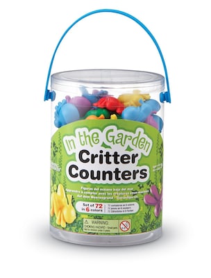 Learning Resources® In the garden critter counter helps to improve counting, sorting, patterning and other early math skills. Set includes dragonfly, snail, grasshopper, caterpillar, spider and bee, sold as 72 per set.