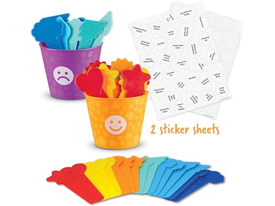 Fill your preschool classroom with social-emotional learning (SEL) skills. Whether they're learning in the classroom or through homeschooling, students learn how to fill their buckets with kindness, attentiveness, and other positive social-emotional skills with these Learning Resources Good Behavior Buckets. This pair of easy-to-visualize early childhood behavior trackers give teachers an easy, interactive way to encourage social-emotional development. Positive behaviors land in the sunny orange bucket, while negative behaviors land in the stormy purple bucket. These Good Behavior Buckets are ready to use in minutes: simply stick the 30 preprinted social-emotional behavior stickers onto fun trackers in six shapes (suns, hearts, and stars for good behaviors; clouds, lightning bolts, and raindrops for challenging ones) and start tracking. For an added level of customization, this set of Good Behavior Buckets also comes with 30 blank stickers ready for personalized behaviors and social-emotional activities for kids. Made from sturdy, colorful plastic, these Good Behavior Buckets are ready for years of social-emotional activities for preschoolers.