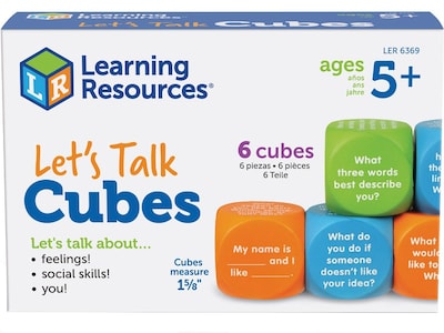 Social and emotional learning in action. Get kids talking, sharing, and learning with the Learning Resources Let's Talk! cubes. This set of six colorful conversation cubes features engaging prompts targeting topics related to social-emotional learning (SEL). One-on-one or in small groups, kids and adults alike can take turns rolling the cubes and answering one of the 36 SEL questions and prompts printed on the sides. The Learning Resources Let's Talk! cubes come with three different SEL categories: roll an orange cube for icebreakers like "What holiday do you like best and why?"; roll a blue cube for social skill prompts like "What steps should you take to tell someone you are sorry?"; or roll a green cube for emotional/feeling prompts like "Name a time when you learned from your mistake." Each of the Learning Resources Let's Talk! cubes is made of durable foam that's ready for years of social-emotional learning activities.