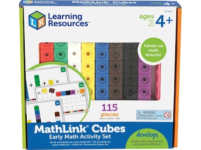 Build new skills one cube at a time! Kids get a hands-on lesson in early math fundamentals every time they build with the MathLink Cubes Early Math Activity Set from Learning Resources. This engaging activity set pairs 100 of the bestselling MathLink Cubes with 15 double-sided activity cards filled with 30 learning challenges that make math lessons fun. Using the colorful cubes as a handy visual aid, little learnings can learn the fundamentals of addition and subtraction, practice sequencing through color and shape recognition, or even learn about perspective through engaging 3D building challenges. When math lessons end, MathLink Cubes double as fun building toys! The sturdy cubes come in 10 bright colors, measure 3/4"L x 3/4"H, and can be snapped together or popped apart over and over again. Cubes work with all MathLink Cubes products, and add extra power to math lessons and building projects.