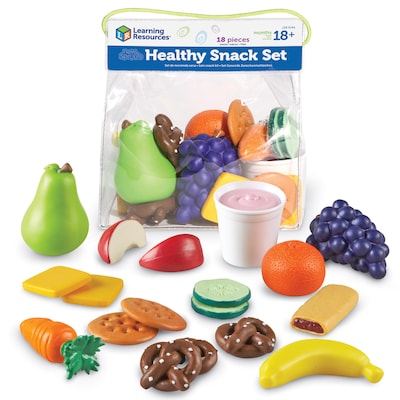 Learning Resources® New Sprouts® Healthy snack set includes 18 pieces fresh fruit, yogurt, granola bar, cheese and more. Set is made of soft, durable plastic with a fresh design suitable for small hands and comes with a storage bag.