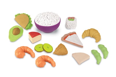 Foods from around the globe set features realistic designs of 15 popular foods from different regions, including a sushi roll, samosa, edamame, and more! Soft, plastic parts make them especially safe for toddlers.