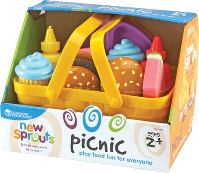 - Durable plastic basket with handles, 2 divided plates, 2 mini-hamburgers (buns and patties), 2 watermelon wedges, 2 cupcakes, and ketchup and mustard bottles that "squirt."