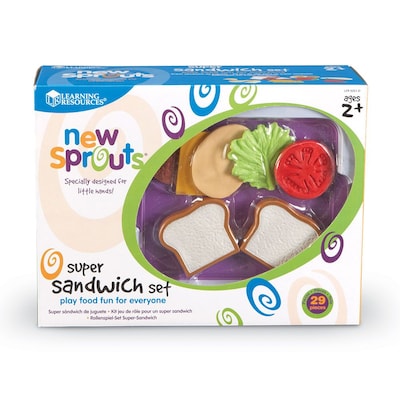 New Sprouts Super Sandwich SetLunch is served with this super set! Watch your hungry toddler make delicious sandwich creations by stacking pieces with a full assortment of white bread or sesame buns, tasty meats, cheeses, and garnishes also don’t forget the chips! Toddlers+ , Ages 2+