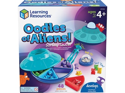 Grab the tri-grip tongs, pop the dice, and help these aliens sort out their spaceship in the Learning Resources Oodles of Aliens sorting game of cosmic proportions. In addition to sorting, this game builds three additional skills at once: strengthen your counting, color recognition, and fine motor skills every time you play. Includes 30 alien creature counters, as well as an activity guide with fun sorting games.