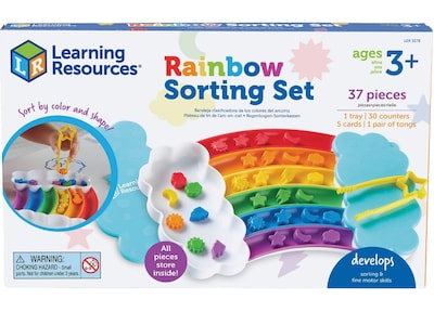 Help your little one learn colors and improve sorting skills with the help of this Learning Resources Rainbow vibrant activity tray. Grab the specially designed rainbow fine motor tongs, then sort and match the set's 30 counters by five shapes (sun, star, cloud, moon, and lightning bot) or six colors (red, orange, yellow, green, blue, and purple).