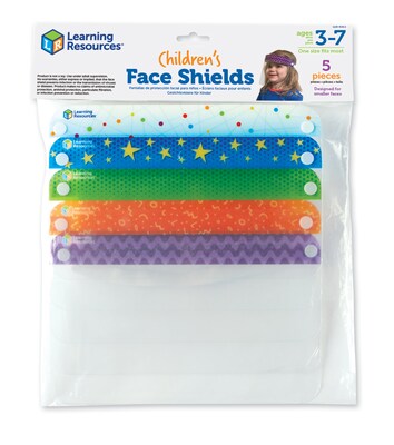 The Learning Resources' set of five child-size face shields in a poly bag with a header. It includes each of five different designs measuring 6.5"H x 10"W (plus a headband). One size fits most, perfect for kids from three to seven years. Product is not a toy. Use under adult supervision. No warranties, either express or implied, that the face shield prevents infection or the transmission of viruses or diseases. The product makes no claims of antiviral protection, particulate filtration, or infection prevention or reduction.