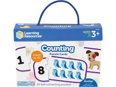 Build new kindergarten readiness skills, one piece at a time! Get your little ones learning and playing at the same time with the Counting Puzzle Cards from Learning Resources. This set of 25 colorful two-piece puzzles helps kids master early counting and number recognition skills through brain-teasing puzzle play. Each matching puzzle features one number from 1 to 25 on one piece, and a corresponding number of illustrated animals and items on the other; as they count and match bluebirds, puppies, hedgehogs, and more, your kids will pick up new early math skills as they play. Designed with little ones in mind, each puzzle is self-correcting, which makes it easier for kids to puzzle out the one right answer. Each set of Counting Puzzle Cards comes in a sturdy reusable box that doubles as a storage container when playtime is done.