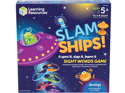 It's the hear-it, see-it, slam-it sight word game of cosmic proportions. Kids build new vocabulary and word recognition skills during every out-of-this-world playtime with the Learning Resources Slam Ships! Sight Words Game. Start by grabbing one of four colorful UFO slammers, each of which comes with a suction cup base, and spreading out some of the set's sight word cards across the table. After one of the sight words is called out, spot the card with the word on it, then slam down your UFO to capture and collect it. Like other swat games, the player with the most sight word cards at the end of the round wins. Every time they slam, kids build the vocabulary and word recognition skills they need to succeed at reading, spelling, and all sorts of language arts. The Learning Resources Slam Ships! Sight Words Game also grows with them: the set's 110 double-sided sight word cards come in five different vocabulary levels that help you increase difficulty and introduce new concepts for a fun twist on kindergarten games.