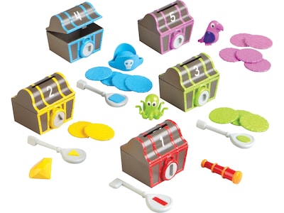 There's pirate treasure afoot, and it's packed with learning fun. Unlock fine motor fun and new sorting and matching skills with the Learning Resources Sorting Surprise Pirate Treasure set. Within each of this set's five numbered plastic pirate chests hides a colorful toy surprise; kids can discover a purple parrot, a green octopus, a red spyglass, and more. Sized for little hands, the keys help kids build coordination and other fine motor skills with every pop of their pirate chests. As they count up their new treasures, kids will also build color and shape identification skills, but that's not all: the Sorting Surprise Pirate Treasure set also includes 15 colored treasure coins that add to the sorting and matching fun. Sort pirate treasures by color, match the coins to their toy surprises, or just drop them through the slots in the tops of the chests. With the Sorting Surprise Pirate Treasure, imaginative adventures never end.
